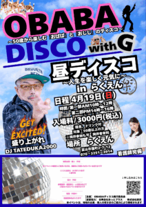 50歳から楽しむ「おばば」と「おじじ」のディスコイベント「OBABAディスコ with G」に、DJタテヅカ2000が出演させていただきます。
